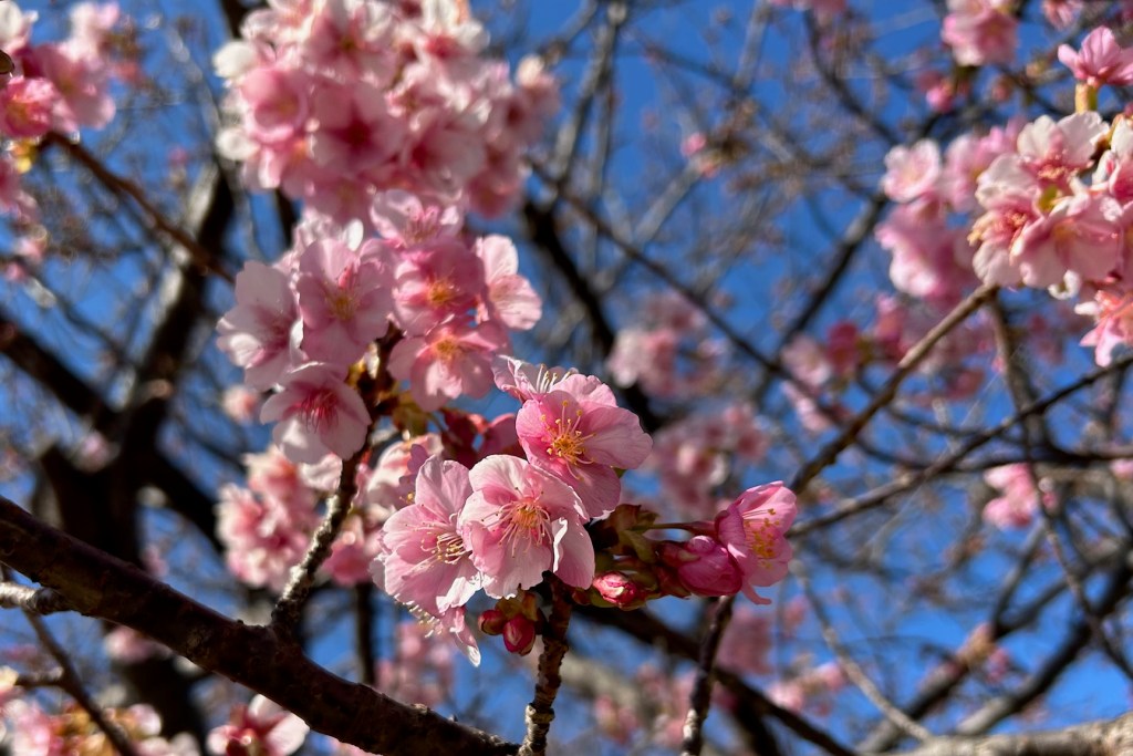 静岡県河津町が発祥の地とされる河津桜は、1955年に発見された野生品種で、寒い時期から咲き始めて開花期間も長いことが特徴とされます。早く咲くのは寒緋桜(カンヒザクラ)の特徴を、立派な花姿は大島桜(オオシマザクラ)の個性を受け継いだ自然交雑の種と考えられているそう。